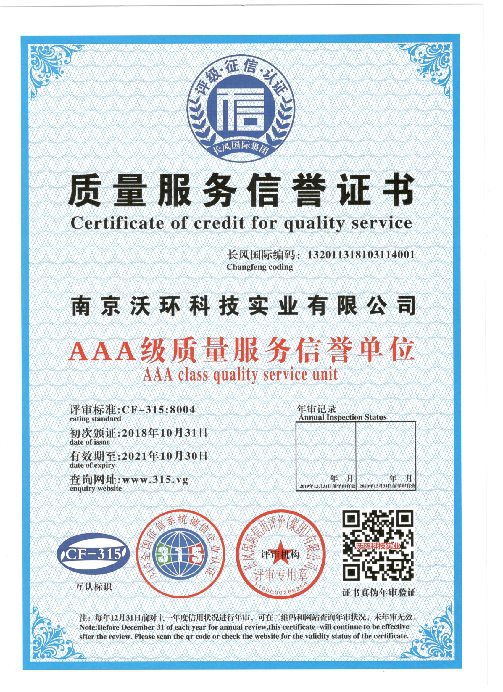 熱烈祝賀南京沃環(huán)公司被專業(yè)評審機構-長風國際集團評為AAA級質(zhì)量服務信譽,特發(fā)此證書