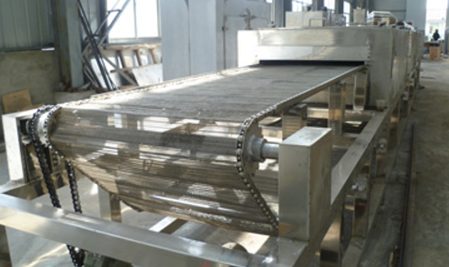 帶式干燥機(jī)概述又稱網(wǎng)帶式干燥機(jī),帶式干燥烘箱,翻板干燥機(jī)。用于透氣性較好的片狀、條狀、顆粒狀物料的連續(xù)成批干燥,尤其適合于含水率高,且具備熱敏性能的物料,如脫水蔬菜、中藥飲片等?筛稍锝(jīng)造粒或制狀后的脫水濾餅類的膏狀物料。對(duì)于含水率特別高的物料,可用多臺(tái)串聯(lián)形成流水線。被干燥烘烤的物料連續(xù)從進(jìn)料口進(jìn)入,通過(guò)網(wǎng)帶傳送裝置勻速經(jīng)過(guò)加熱隧道,向出料口運(yùn)行。物料在運(yùn)行過(guò)程中被加熱,將濕氣或溶劑蒸發(fā)后排出室外。一般為單層式結(jié)構(gòu),有時(shí)為了節(jié)約空間增加產(chǎn)量,會(huì)設(shè)計(jì)制造成三到九層結(jié)構(gòu)。